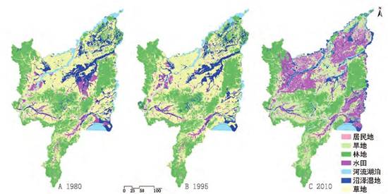 图1 三江平原景观格局变化(A.1980年;B.1995年;C.2010年)