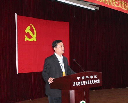 中共长春分院党组书记、常务副院长甘建国在会上做了重要讲话,他充分肯定了自第二次党代会以来,东北地理所党委紧紧依靠全体共产党员和广大职工,认真贯彻落实科学发展观和中科院党组的重大决策,充分发挥政治核心和监督保障作用。不断创新推进党的建设,研究所的科技创新能力和可持续发展能力显著增强。他同时衷心希望通过这次大会,全面总结过去四年研究所党建工作成绩,谋划未来五年研究所党建工作的发展战略和主要任务,为研究所科技创新提供强有力的思想保证和精神动力,团结和动员全所党员和广大职工认清形势、开拓创新、扎实工作,把东北地理所早日建成“四个一流”的研究所。