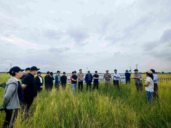 观摩会上,与会专家学者实地考察了到保镇盐碱地“羊草免耕秋播”及“新品种+新改良剂+新种植技术”示范地、国家牧草体系基地“羊草种质资源圃”、青山镇轻度盐碱地“生态间作条播技术”及羊草种子扩繁基地。通过现场观摩、听取介绍和交流讨论,全面了解了“以草治碱”项目在盐碱地精准诊断分级、优质耐盐碱羊草新品种应用等方面的最新成果与实践经验,深入探讨其在品种选育、栽培管理、生态功能、饲用价值等方面的应用优势。