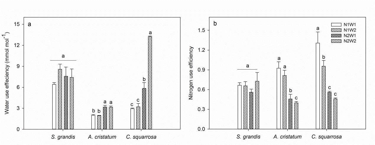 图2 大针茅、冰草和糙隐子草在不同水氮条件下的水分利用效率(a)和氮素利用效率(b)。