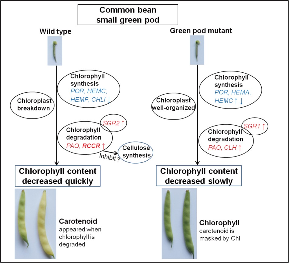 野生型黄金勾的豆荚随着生长快速褪绿变黄,而在突变体库中出现较高比例的绿色豆荚突变体,该突变体的豆荚颜色一直保持绿色。为研究黄金勾豆荚褪绿及类黄酮营养成分的变化,对3个发育阶段的豆荚进行了转录组和代谢组测序。随着豆荚的发育,叶绿素含量不断降低,在野生型黄金勾中下降速率更快。对叶绿素代谢通路分析发现,叶绿素降解基因红色叶绿素降解产物还原酶(RCCR)在黄金勾绿色小豆荚中高表达,而在绿色豆荚突变体中其表达量极低,推测该基因是黄金勾豆荚褪绿的关键基因。另一方面,绿色豆荚突变体豆荚质地较硬,烹饪口感差,通过对纤维素含量进行测定,发现绿色豆荚突变体中纤维素含量显著高于野生型。且与野生型相比,绿色豆荚突变体中叶纤维素合成基因表达量上调。通过豆荚代谢组研究,共检测到154种类黄酮物质,且随着豆荚发育,多数类黄酮物质含量降低。在黄金勾中,柚皮苷,牡荆素-2-O-鼠李糖苷,异槲皮甙,槲皮素,山奈酚,紫云英苷和芒柄花苷含量较高。而木犀草素,芹菜素,李属异黄酮,鹰嘴豆素,黄颜木素在绿色豆荚突变体中含量较高。该研究从生理和分子水平揭示了黄金勾豆荚褪绿的机制,并对豆荚发育过程中类黄酮物质进行代谢分析,为解析营养物质变化提供理论基础。