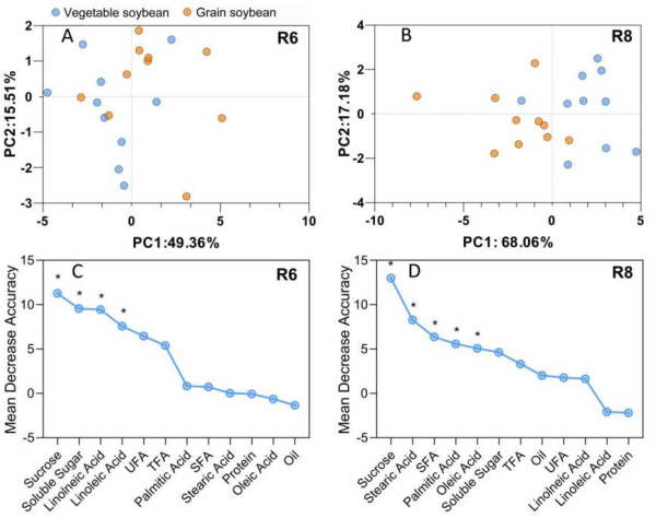 本研究选取了10个鲜食大豆和10个粒用大豆品种(系),对其营养成分进行了全面比较。研究发现,鲜食大豆在蔗糖、可溶性糖和粗蛋白含量上显著高于粒用大豆,而在粗脂肪和总脂肪酸含量上则相对较低。在鲜荚阶段,鲜食大豆含有较高比例的不饱和脂肪酸,尤其是油酸。通过主成分分析(PCA)和机器学习算法,发现鲜食大豆和粒用大豆在营养组成上存在明显差异,并且蔗糖是区分鲜食大豆和粒用大豆的最关键营养标志物(图1)。