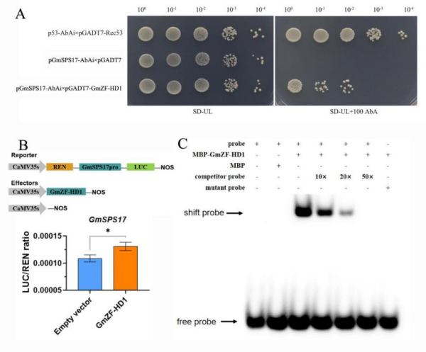 此外,结合动态RNA-seq及加权基因共表达网络分析(WGCNA),研究人员进一步挖掘了与蔗糖积累相关的基因模块,并鉴定了GmSPS17作为蔗糖磷酸合成酶(SPS)编码基因,以及其上游转录因子GmZF-HD1。进一步的分子试验和遗传转化试验证实了GmZF-HD1通过直接激活GmSPS17的转录来增加蔗糖积累。在大豆毛状根过表达体系中,GmZF-HD1能够显著增强GmSPS17的表达,从而提高蔗糖的积累量。本研究明确了蔗糖作为区分鲜食大豆和粒用大豆的关键营养标志物,揭示了GmZF-HD1通过GmSPS17调控蔗糖积累的分子机制(图2)。研究结果为开发高糖鲜食大豆品种提供了重要的指导。