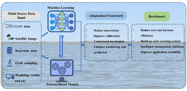 图1. 耦合多源数据、机器学习与过程模型的水质监测、预测、管理协同框架图