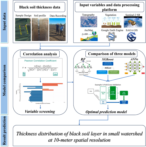 在数据融合的基础上,研究人员构建了随机森林(RF)、极端梯度提升(XGBoost)和人工神经网络(ANNs)三种机器学习模型。结果显示,引入光谱信息后模型精度显著提升,其中随机森林表现最佳,R² 达 0.75,均方根误差仅 8.88 厘米。进一步分析表明,地形因子在预测中贡献最大,而光谱信息提供了关键补充,两者结合显著增强了复杂坡耕地环境下的预测能力。基于最优模型,团队绘制了研究区黑土层厚度分布图,揭示出“高处薄、低处厚”的典型空间格局,为深入理解黑土侵蚀—沉积过程提供了新证据。