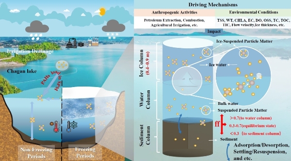 研究成果以题为《Winter behavior of polycyclic aromatic hydrocarbons in frozen lakes: fugacity insights into partitioning,transport,and key driving mechanisms》,近期发表于国际期刊Environmental Pollution(影响因子IF=7.3),本文由水环境健康与模拟组特别研究助理鞠含俞为第一作者,通讯作者张敬杰研究员和姜力力博士生等共同完成。研究得到了国家自然科学基金面上项目以及国际(地区)合作与交流项目(42471089.4231101419)、吉林省国际科技合作项目(20240402026GH)及吉林省青年人才托举工程(QT202330)的资助。