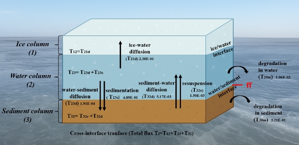 图2.PAHs在冰层、水层、沉积物层的质量平衡图