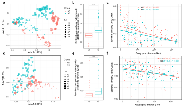 从“分类组成-功能特征-生态策略” 多维尺度研究发现,农业活动不仅降低了土壤微生物在分类和功能基因层面的空间异质性,还促使细菌群落的生态策略向快速生长和胁迫耐受型转变,导致其在局域和区域尺度上出现系统性趋同,这一趋势削弱了土壤生态系统的适应性与恢复力,可能影响养分循环效率和系统稳定性。因此,在农业景观中保留自然生境、推行多样化种植、减少化肥农药投入等措施,有助于维持土壤生物的空间异质性与功能多样性,从而增强农业生态系统应对未来环境变化的缓冲能力。