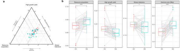农田土壤显著降低了土壤生物群落在分类组成、功能基因和生态策略的空间异质性。农田土壤中细菌、真菌、古菌、微型动物群落(图1)及功能基因(图2)在局域和区域尺度均表现出显著的均质化趋势,这种均质化现象与土壤性质的趋同性密切相关。农业活动改变了细菌群落的生态策略(“Y-A-S” 理论框架,图3),其资源获取(A策略)的功能基因减少,而与生长产量(Y策略)和胁迫耐受(S策略)的基因显著增加,表明农业系统更倾向于选择快速生长、抗逆性强的微生物类群。农田土壤中细菌的平均基因组大小显著减小,反映了在农业干扰下微生物通过“基因组精简”(Black Queen hypothesis)降低了生物的代谢成本、提高了适应性的生态权衡。