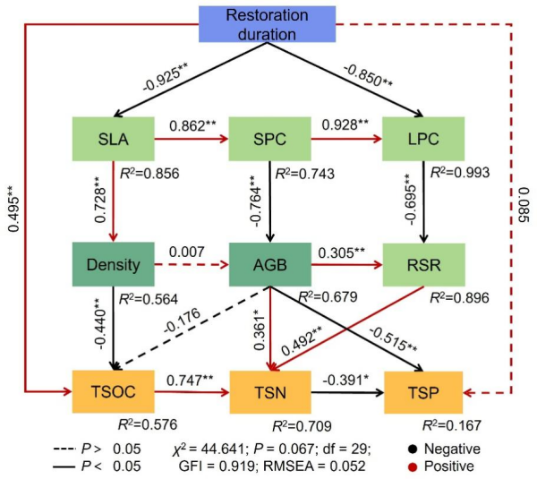 研究团队分析了农业退耕后自然恢复的淡水沼泽湿地的土壤功能、植物群落特征和功能性状。结果表明,土壤有机碳储量和氮储量分别在恢复14和17年达到峰值后趋于稳定,而磷储量则先下降后上升。方差分解分析表明,土壤功能动态主要由植物群落特征与功能性状的相互作用驱动。随机森林模型确定了关键驱动因素,而结构方程模型确定了恢复时间对土壤功能的直接影响和植物变量介导的间接途径。具体而言,比叶面积与植物密度协同下降,促进了土壤有机碳积累;比叶面积与茎磷含量协同降低,提升了地上生物量和土壤总氮,但减少了土壤磷的累积。此外,基于性状交互作用的生态功能恢复理论框架,在自然恢复草甸中也得到了验证,并强调了恢复目标群落比单一目标物种更能提升生态功能,突破了传统以目标物种为中心的恢复策略。
