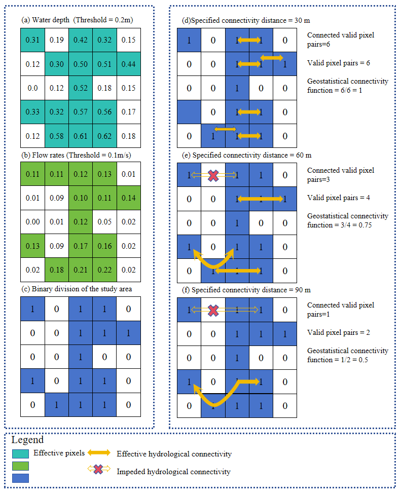 图1 连通性函数计算示意图(有效像素对是指空间中由特定向量(距离和方向)分隔的一对网格单元,其中两个像素均具有有效数据值;地统计函数表示在给定距离内沿特定方向连接的有效单元的比例,表征水平面上各点之间形成水文连通性的可能性。)