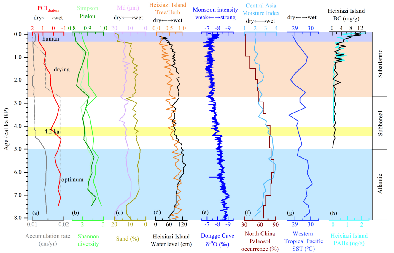 东北地理所大气环境与生态演变学科组基于多指标古生态学记录,结合硅藻和粒度特征,重建了抓吉湿地历史时期水位变化过程,探讨中晚全新世三江平原湿地水文演化对EASM的响应机制。研究结果表明:抓吉湿地的水位波动在全新世中晚期与EASM强度紧密相关。由于硅藻对水文气候变化的高度敏感性,其清晰地记录了温暖湿润的全新世气候适宜期、中世纪暖期,以及寒冷干燥的4.2ka事件和小冰期等关键气候事件。在大西洋时期,抓吉湿地的PC1diatom、粒度中值粒径和砂含量均处于最低水平,表明当时水位最高。受强EASM影响,气候条件适宜,抓吉湿地的硅藻物种多样性及沉积物累积速率均达到最高。在亚北方期,特别是亚大西洋时期,PC1diatom和粒度均表明由于EASM强度减弱,抓吉湿地水位持续下降。湿地干旱化显著降低了沉积物累积速率和硅藻物种多样性。值得注意的是,硅藻组合最显著的变化是300年前干旱指示物种Hantzschia amphioxys和Pinnularia subcapitata突然增加,抓吉湿地的砂含量也达到峰值。近300年来人类活动的加剧导致抓吉湿地严重干旱,硅藻物种多样性降至最低。三江平原的农业活动导致了土壤侵蚀,致使湿地的沉积速率有所增加。