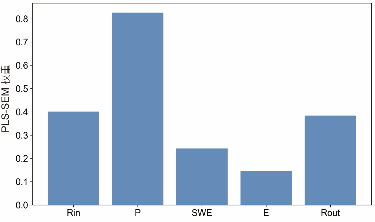 图 2 入湖径流量(Rin)、降水量(P)、积雪水当量(SWE)、湖面蒸发量(E)以及出湖径流量(Rout)对兴凯湖水位变化的PLS-SEM权重分析。
