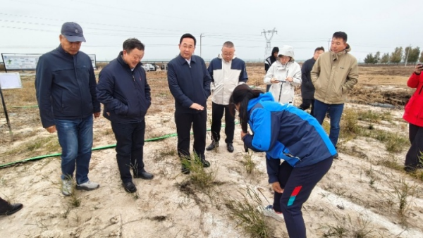 在好腰苏木草地验证点,子课题负责人马红媛研究员详细介绍了耐盐碱牧草品种筛选与高效建植技术、重度盐碱地羊草顶级植被恢复与高产栽培技术等个性技术的优势和实施效果。随后,参加观摩活动的领导和嘉宾共同详细查看了耐盐碱牧草的筛选与培育技术,深入了解到技术实施的成效以及面临的困难,对草地验证点的建设及技术取得的成效给予了充分肯定。
