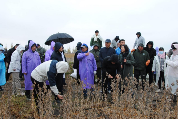 在秋日的连绵细雨中,现场测产和观摩活动同步进行。由吉林大学植物科学学院院长都兴林教授等25位吉、黑、辽及内蒙地区的领域内知名专家组成了五个测产专家组,分别对验证区内降碱沃土共性技术与个性技术、耐盐碱作物品种筛选与配套栽培技术,现用模式集成验证等试验进行现场测产,测产作物包括玉米、大豆、高粱等。