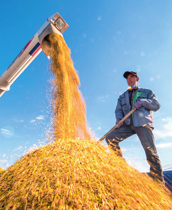 2018年9月17日,吉林省吉林市一拉溪镇,农民在整理收获的水稻 许畅摄 / 本刊