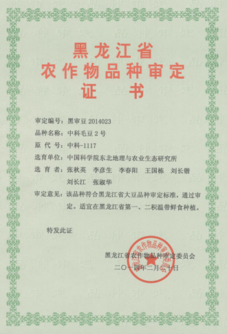 2014年3月4日,由我所张秋英研究员课题组选育的“中科毛豆2号”(登记编号:黑登记2014023)顺利通过“黑龙江省农作物品种审定委员”的新品种审定,准予在东北适宜地区推广。