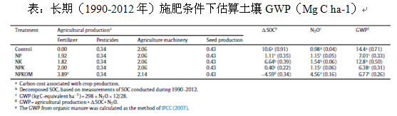 全球增温潜势(Global Warming Potential)是目前衡量温室气体增温能力的一个通用指标,而温室气体直接影响全球气候变化,直接威胁到人类社会的可持续发展。黑土农田生态系统对气候变化的影响是全球变化研究的重要内容之一,目前,有关长期施肥对黑土农田GWP的影响还不清楚。为此,我所土壤物质循环学科组乔云发等人利用中国科学院海伦农业生态实验站长期施肥定位试验,选取长期不施肥(CK),缺钾施肥(NP),缺磷施肥(NK),平衡施肥(NPK)和无机配有机施肥(NPKOM)五个处理,将农业生产过程中农业机械、生产化肥、生产有机肥、生产农药和精选种子过程中的CO2排放、土壤N2O排放和土壤碳库平衡融为一体,系统研究了长期不同施肥条件下,黑土农田生态系统对全球增温潜势的影响。