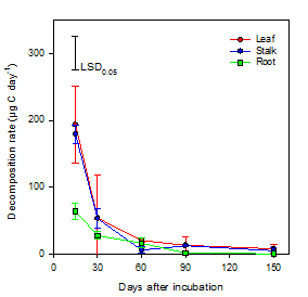 图1 植物残体(叶片,茎秆,根)在土壤中的腐解速率