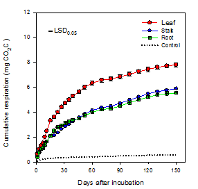 图2 150天培养时间内不同残体加入土壤后的累加呼吸