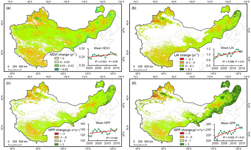 图 中国干旱-半干旱区主要生态系统参量年际变化趋势