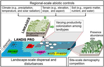 图1.结合区域、景观和林分尺度过程的树种分布耦合模拟方法