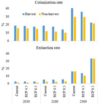 图2.树种(以white oak 为例)在2050年、2100年和2300年的定殖率(colonization rate, top left)及灭绝率(extinction rate, bottom left)以及树种在2300年的空间分布变化(right)