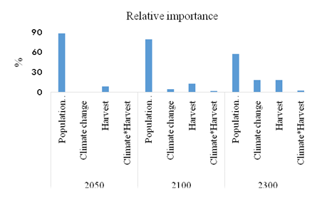 图3.种群动态、采伐、气候变化及其交互作用对树种(以white oak 为例)分布变化的相对贡献