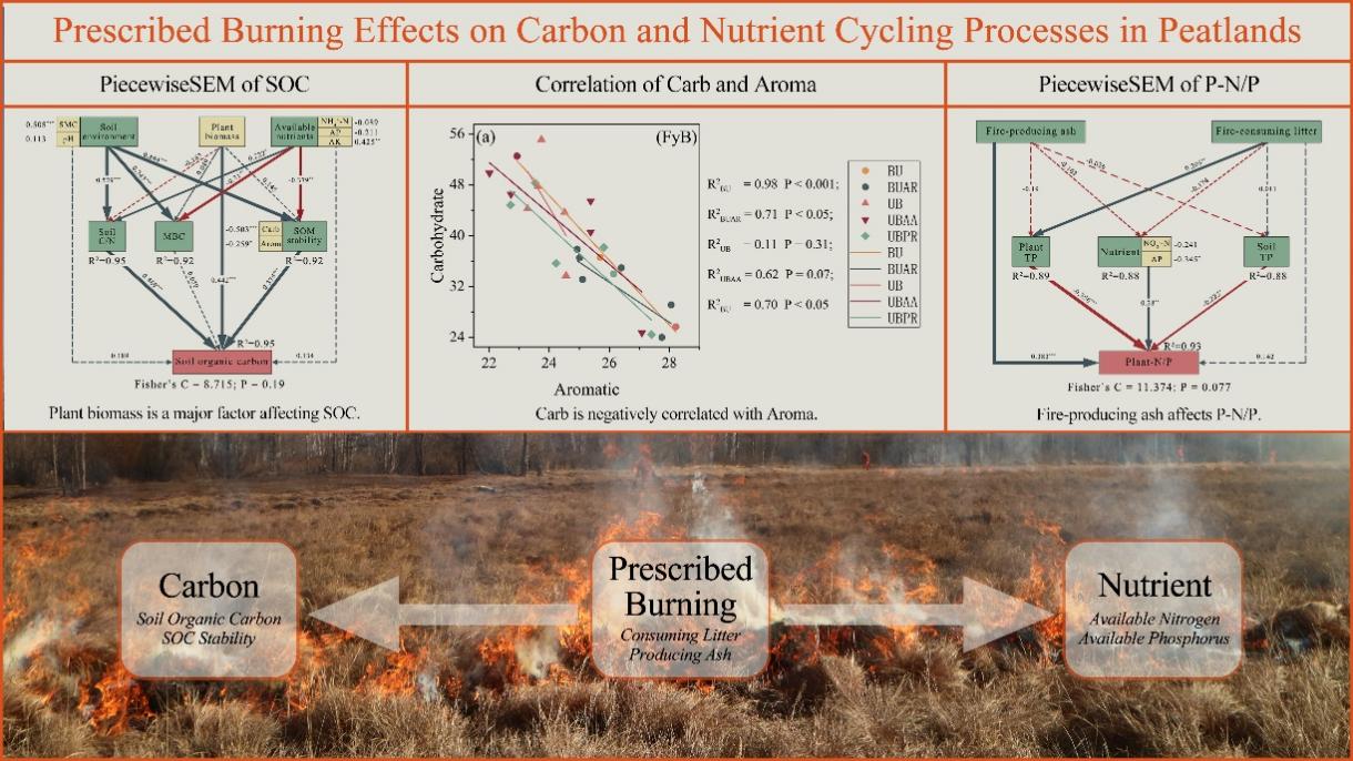 中国科学院东北地理所湿地演化与生态功能学科组与东北林业大学、吉林农业大学等高校合作,自2020年起在大兴安岭地区的林缘泥炭地进行长期计划火烧模拟试验(图 1),探究计划火烧影响下多年冻土区泥炭地土壤碳稳定性以及养分循环影响。研究发现,随着计划火烧次数的增加,泥炭土壤总碳含量逐渐下降,原因在于连续火烧导致游离颗粒有机物(fPOM)降低。土壤有机碳的结构方程模型表明,计划火烧后植物生物量的增加直接影响了泥炭地的碳累积,而土壤含水率和pH通过影响土壤碳氮比和土壤有机碳稳定性间接影响了碳累积(图2)。此外,计划火烧导致泥炭地生态系统从氮限制向磷限制转化,植物氮磷比的结构方程模型表明,火后产生的热解碳是驱动氮限制向磷限制转化的主要原因。