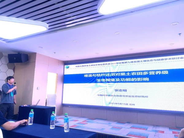 为了增进学术交流,推动项目的高效执行,2025年8月14日至17日,课题2骨干张志明高级工程师参加中国土壤学会土壤生态专业委员会2025年会暨第九届全国土壤生态与健康学术研讨会,并以“增温和秸秆还田对黑土农田多营养级生物群落及功能的影响”为题在土壤食物网与多功能性分会场做学术报告,探讨了土壤多营养级生物群落特征在不同秸秆还田方式影响下对黑土土壤健康的驱动机制,受到与会专家的广泛关注。大会在“山水林田湖草沙一体化保护与修复”“碳达峰碳中和”以及“藏粮于地、藏粮于技”等国家战略持续推进的背景下,面向土壤学、生态学和环境科学等领域的研究热点,深入探讨土壤生态系统结构与功能维持机制,为土壤健康管理与生态系统服务能力提升赋能,推动了国家自然科学基金区域创新发展联合基金集成项目相关研究的纵深突破。