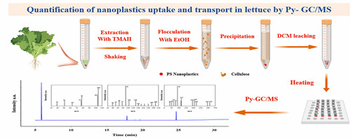 在日益严峻的环境污染挑战中,微塑料(MPs)与纳米塑料(NPs)作为新污染物,已广泛分布于自然环境中,威胁着陆地生态系统健康。环境中的NPs质量较低,难以精确检测,其环境风险评估一直面临技术瓶颈。东北地理所环境生态学科组研究团队通过优化提取程序和仪器的热裂解温度,成功开发出一种基于热裂解气相色谱质谱(Py-GC/MS)鉴定和定量植物中纳米塑料的方法,有效解决了这一问题[1]。该方法具有高度灵敏、操作简便的优点,并且避免了金属标记元素对植物的干扰。已成功将该方法应用于生菜对纳米塑料吸收情况的量化研究。