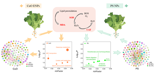 在建立分析方法的基础上,该团队对比并揭示了NPs和工程纳米颗粒物(ENPs)对生菜的差异作用机制[2]。研究发现,暴露于NPs和ENPs的生菜中,氧化铜(CuO)ENPs引起的生菜膜损伤最为严重,根系通过上调半乳糖代谢和改变亚油酸代谢对CuO做出响应,而暴露于NPs的根系通过调节氨基酸、辅因子和维生素代谢应对NPs胁迫。这些代谢途径的改变进一步调节了CuO和NPs对根际微生物的不利影响。