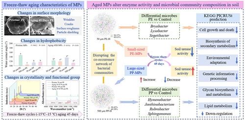 针对寒冷地区特有的冻融(FT)循环现象,该研究团队进一步探索了FT老化后的MPs对土壤酶活性和微生物群落结构的影响[4]。研究结果表明,FT老化后的MPs表面形貌和疏水性改变,结晶度降低。小粒径的MPs抑制了土壤脲酶的活性,而大粒径的MPs提高了土壤脲酶活性。FT老化的MPs显著改变了土壤微生物的群落结构,增加了细菌群落共现网络的复杂性。FT老化后的MPs还会影响遗传信息和细胞过程,并破坏次级代谢产物的生物合成。