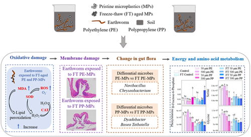 与此同时,该团队还揭示了FT老化的MPs对蚯蚓的毒性作用机制[5]。结果发现,FT老化的聚丙烯(PP)MPs比原始PP-MPs对蚯蚓造成更严重的氧化应激和膜损伤。FT老化的MPs会导致蚯蚓肠道菌群失衡并富集具有塑料降解能力的微生物属。与原始的聚乙烯(PE)MPs和PP-MPs相比,FT老化的PE-MPs通过上调脂质和类脂分子来影响膜转运,而FT老化的PP-MPs通过下调有机杂环化合物来改变外源物质的生物降解和代谢。