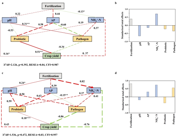图1 不同施肥处理下土壤性质、益生菌、病原菌对玉米(a, b)和大豆(c, d)产量直接和间接影响的结构方程模型(SEM)