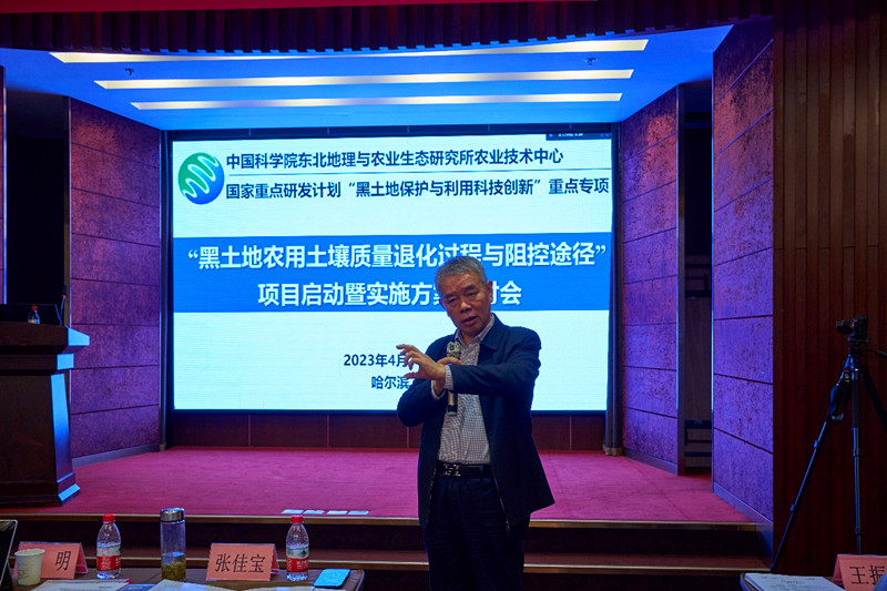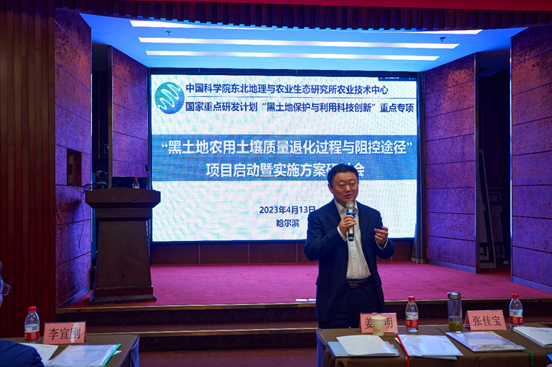 4月13日,由中国科学院东北地理与农业生态研究所农业技术中心牵头承担的国家重点研发计划“黑土地保护与利用科技创新”重点专项“黑土地农用土壤质量退化过程与阻控途径”项目启动会在哈尔滨举行。出席会议领导有黑土地专项跟踪专家组中国科学院南京土壤研究所张佳宝院士,中国农村技术开发中心王振忠和孟庆峰项目专员,中国科学院科技促进发展局农业科技办公室曾艳副研究员,黑龙江省科学技术厅农村科技处李宜刚处长和刘淑艳二级调研员,中国科学院东北地理所所长姜明、副所长王宗明,农业技术中心科研计划与财务处处长刘俊杰,项目、课题负责人及项目相关人员50余人参加此次会议。会议由王宗明副所长主持。