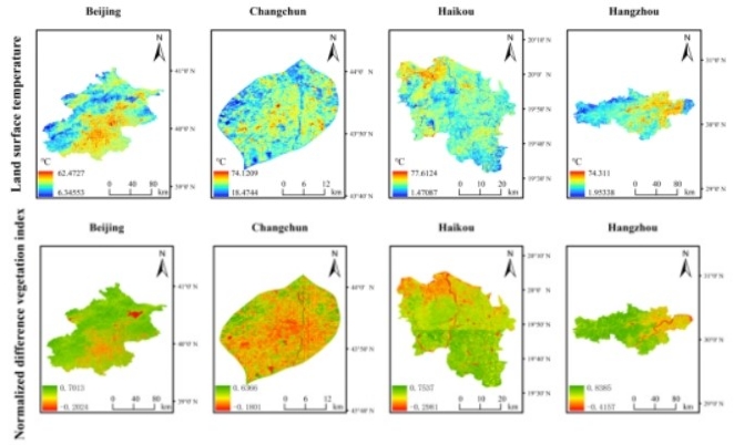 利用遥感数据量化长春市、北京市、杭州市及海口市现有城市绿地的三个关键变量,即制冷效率、制冷能力和制冷效益。在景观尺度上,城市绿地与温度通常呈负相关且相对线性相关,即城市绿地数量越多,温度越低。冷却效率被广泛用于衡量城市绿地面积的增加导致温度下降的程度,即城市绿地与温度关系的斜率。这个简单的指标可以量化城市绿地的质量,以改善城市热岛效应。与此同时,现有城市绿地冷却整个城市表面温度的程度(与没有植被的建成区相比)被称为制冷能力。因此,制冷能力是城市绿地总量及其制冷效率的函数。