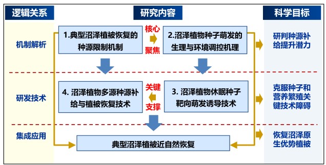 王国栋研究员牵头负责的“东北典型沼泽植物种源补给与种子萌发诱导技术与应用”项目针对东北沼泽原生优势植物难以恢复问题,以生态修复的“限制性因子原理”为指导,拟揭示东北典型莎草类沼泽生态恢复的种源限制机制,阐明莎草类优势植物种子萌发的生理抑制与环境调控机理。研发莎草类沼泽优势植物种子靶向萌发诱导技术,研发融合种子和营养繁殖体的多源种源补给技术,克服关键种源限制,实现沼泽植被的近自然恢复,并在东北典型沼泽分布区开展应用,支撑我国沼泽湿地保护修复重大工程。该项目由中国科学院东北地理与农业生态研究所牵头,东北林业大学、东北师范大学2家单位参加。