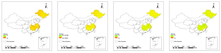 2005-2020年东北地区和长江中下游地区耦合协调度插值图