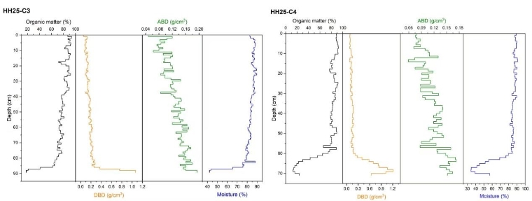 目前已在三江平原洪河泥炭地完成了野外考察及长泥炭柱芯初步采样工作,其中两根柱芯已完成泥炭岩性分析与测年层位挑选,并对植物大化石进行了初步鉴定。之后,将根据AMS 14C测年结果确定定量计算泥炭碳累积速率,并逐步开展植物大化石分析、碳同位素分析以重建泥炭地水文变化与区域降水变化,通过污染物分析及炭屑分析以重建人类活动强度。