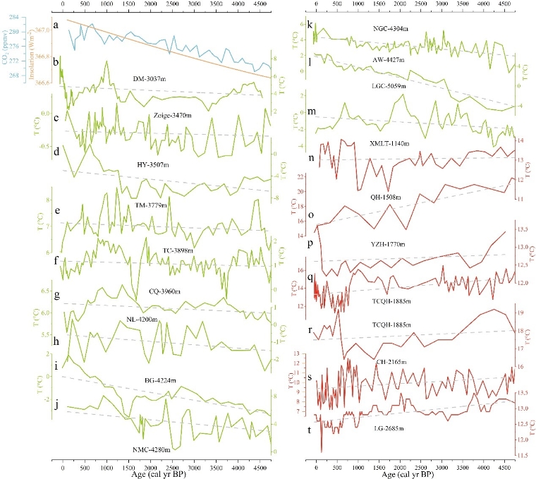 中晚全新世作为人类文明发展的重要时期,气候变化在该时期的文化演变中发挥了关键作用。因此,准确重建这一时期的总体温度变化趋势对于理解人类文明的演化过程具有重要意义。然而,目前对于中晚全新世的长期温度变化趋势的研究仍然存在不少争议,特别是这一时期人类活动的增强导致温度重建记录更加复杂。人类活动如何影响气候变化,以及其对不同区域和不同海拔之间的影响是否存在差异,仍需深入研究。该研究利用达马泥炭地(DM peatland)岩芯中支链甘油二烷基甘油四醚(brGDGTs)生物标志物,定量重建了中晚全新世(过去5000年)以来的年均温记录。在此基础上,研究搜集汇整了已发表的定量温度记录(包括年均温度、无冰期温度和夏季温度记录),探讨该地区中晚全新世温度变化的时空特征。研究发现,自中晚全新世以来,高海拔地区(> 3000米)的年均温度记录普遍呈整体升温趋势,与当地太阳辐射强度和温室气体浓度变化趋势一致。相反,低海拔地区(< 3000米)的年均温度表现为明显的降温趋势,这可能与低海拔地区人类活动的增强有关,因其对当地植被和地表的影响加剧,导致流域的土壤更易受到降水侵蚀。该研究为理解中晚全新世以来不同海拔地区古温度变化特征以及人类活动对古温度重建的影响提供了新的视角。