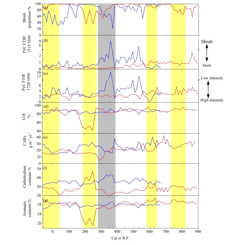 泥炭地作为长时间尺度固碳效率最高的自然生态系统,储存全球土壤碳库近30%,并有大约144Pg碳储存在多年冻土泥炭地中。由于这些泥炭地位于多年冻土区,相比于其他地区泥炭地,更容易受到气候变化、火扰动及区域人类活动的叠加影响。泥炭地作为高碳密度自然生态系统,未来全球变化影响下,泥炭地碳库究竟是碳的“定时炸弹”还是“金矿”已引起广泛讨论。尽管泥炭地碳库稳定性是影响其应对全球变化过程中的一个关键因素,然而,很少有研究侧重于评估长时间尺度下环境变化对泥炭地碳库长期累积过程和稳定性的影响。本研究以大兴安岭典型冻土泥炭地为研究对象,利用泥炭沉积记录中保存的有机质和热解碳的化学结构特征,重建过去千年里大兴安岭冻土泥炭地的有机质来源、火烧强度及燃料来源特征,并通过对比分析泥炭地过去千年里碳累积速率和碳库稳定性演变过程,评估气候变化影响下,火烧和有机质来源改变对冻土泥炭地碳库累积和稳定性演变过程的影响。