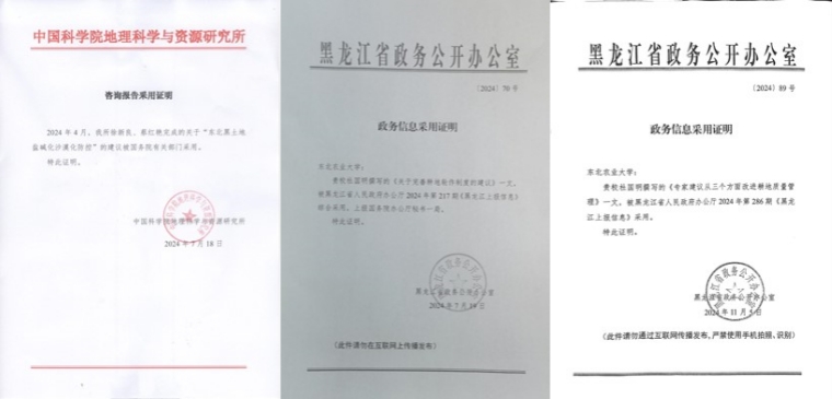 以黑土地耕地质量关键要素数据集为基础,结合众多文献的研究结论,初步明确了黑土地耕地质量的相对稳定因子、变化因子和退化因子。该结果为完善耕地质量建设管理制度、进一步提高黑土地区耕地质量提供保护策略。同时,揭示了2000年以来东北黑土地耕地资源的时空演变过程、城镇扩展对耕地资源的侵占、耕地产能稳定性的区域差异、新增耕地空间格局及产能状况、耕地实际生产力与生产潜力的差距、气候变化与土地利用变化对耕地生产潜力的影响等方面的科学规律,提出了气候变化背景下加强东北黑土地盐碱化沙漠化防控、完善耕地轮作制度、从三个方面改进耕地质量管理等方面的咨询建议,并分别被国办和黑龙江省人民政府办公厅采纳,对保护东北黑土地耕地资源,保障国家粮食安全,从政策制定和科学支撑发面发挥了重要作用。