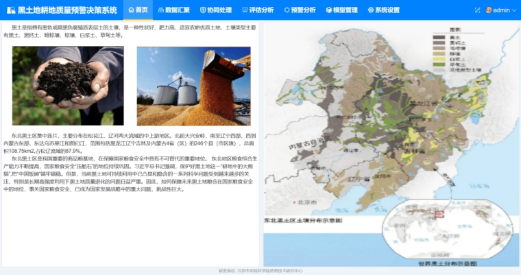研发了面向耕地质量红线管理与社会发展需求的黑土地耕地质量决策预警系统,突破了耕地质量关键要素监测数据特征辨识、耕地质量监测大数据协同分析、黑土地耕地质量多目标多尺度预警模型等关键技术问题,能及时把握耕地质量时空动态和演变趋势,可服务于东北黑土区农业、自然资源和环保部门的各级耕地监管和利用管理,支撑《国家黑土地保护工程实施方案(2021-2025 年)》、黑土地保护利用工作。