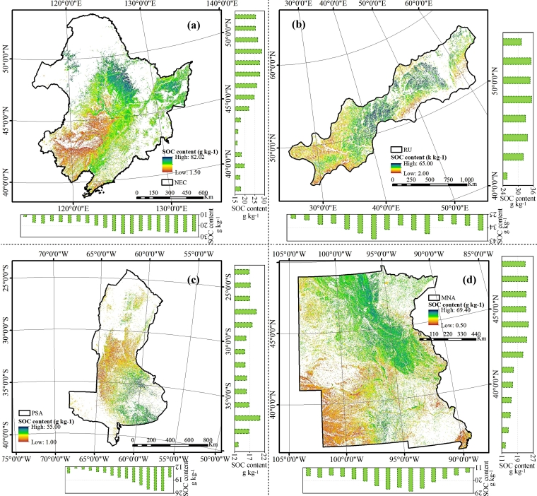 针对中国耕地复杂地理环境与土壤类型、农业分区特点,研发了一套融合多时相多光谱信息、高光谱信息和地形信息的多尺度(田块、县域、东北黑土区、四大黑土区)耕地土壤有机质含量反演制图的技术体系,绘制了米级分辨率的县域尺度SOM含量空间分布结果、10m空间分辨率的中国东北黑土区SOM含量空间分布、1984年以来8期30m空间分辨率中国东北黑土区和四大黑土区的SOM含量空间分布数据集。该技术支撑我国率先具备了融合多源遥感数据并利用深度学习模型进行高精度、规模化、多星协同业务的土壤有机质含量监测能力,克服了多数已有产品中高SOM空间异质性以及小样本对SOM预测带来的负面影响。