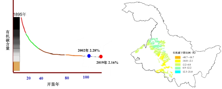 黑龙江省黑土有机碳平均下降量(左)与下降比例空间分布(右)